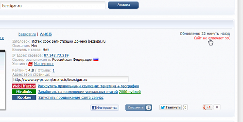 Пытаюсь провести анализ сайта bezsigar.ru на www.cy-pr.com , но пишет что сайт не отвечает, на других ресурсам все нормально.