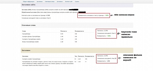 Добрый день уважаемые вебмастера. Недавно обнаружил суть проблемы "Почему люди не заходят на сайт с ПС". Ответ простой нет релевантности страниц к запросу, тематика сайта "Фильмы онлайн", движок DLE, Ниже скриншот проверки. Сайты данной тематики тяжело продвинуть без больших средст, но возможно. Если можно ответьте на один вопрос: как закрыть роботу путь к описанию фильма? Что бы он его не считывал, а индексировал например: Год выпуска фильма, Страна и т.д. Благодаря этому релевантность повысится и людей на сайте станет больше.