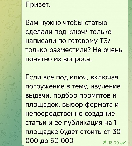Пару дней назад, стал свидетелем одного из диалогов, между человеком интересующимся оптимизацией статей под GEO и представителем агентства которое оказывает такие услуги. На скриншоте ответ представителя.