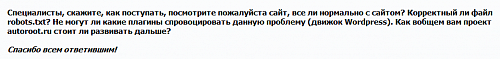 Специалисты, скажите, как поступать, посмотрите пожалуйста сайт, все ли нормально с сайтом? Корректный ли файл robots.txt? Не могут ли какие плагины спровоцировать данную проблему (движок Wordpress). Как вобщем вам проект autoroot.ru стоит ли развивать дальше?
