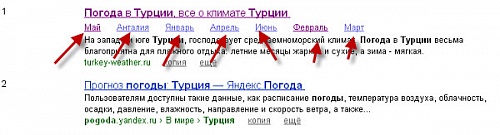 Удивительный ресурс в ТОПЕ-10 . На картинке хорошо видно, что ЯША дополнительно к описанию сайта выводит гиперссылки ! Тем самым значительно увеличивая кликабельность по запросу "погода в турции".