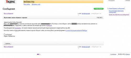 7-го февраля пришло сообщение в ЯВМ что мой сайт склеен с чужим сайтом и он считается главным зеркалом, причем чужой даже не работает. В итоге сайт выпал из яндекса.