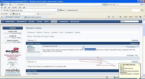 так прикол в том что нод32 ищет вирус! яндекс мне не написал что угроза на сайте! я 10 рас отсылал проверьте тд и тп! ответа не было 1 пришел вирусов не обнаружено! найти его я не могу!