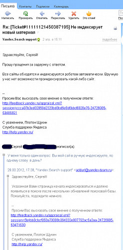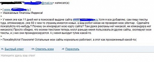 Тема моего обращения: Сайта нет в поисковой выдаче. Я конечно всё подробно расписал...и вот..