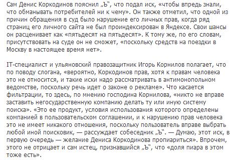 Коркодинов обвиняет интернет-компанию в том, что рекламный слоган для ее поисковой системы “Найдется все” не соответствует действительности. По словам ульяновца, на 31 мая поисковик не индексировал сайт местной газеты “Новый град Симбирск”, в которой он работал.