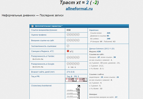 Есть сайт allneformal.ru, которому порядка 9 месяцев. В свои 7 месяцев существования сайт имел ~7 000 страниц в индексе и 10 тИЦа. Но потом Яндекс остыл и всё. Сейчас в индексе 8 страниц и в последний АП забрали тИЦ.