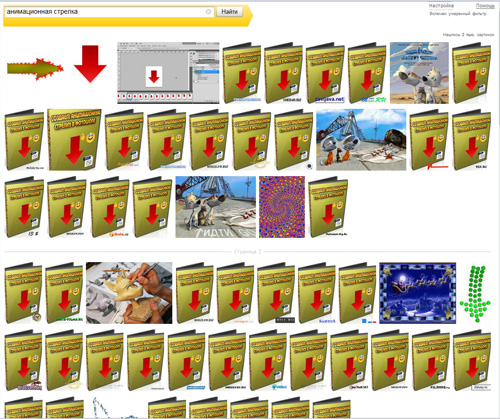 На 5 первых страницах (скрин только 1 страницы) в подавляющем большинстве торжественно сияли тупые обложки книги "Создаем анимационную стрелку в фотошопе" в просто неимоверном количестве.