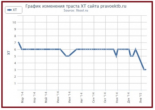По данным http://xtool.ru/trast.php?site=pravoektb.ru резкое падение траста с 6 единиц до 3: