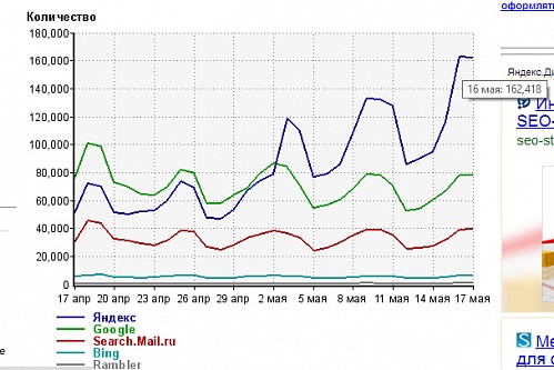 Ну здесь виден стабильный рост. Сайт по ходу развлекательный, рост как раз припал на очередные выходные. |
