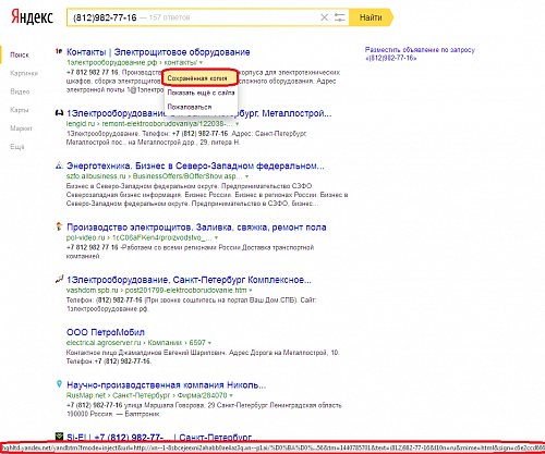 Как сказал Ять, эта ссылка сохраненной копии сайта из поисковой выдачи Яндекс. Запрос был такой: "(812)982-77-16", о чем говорит параметр &text в ссылке. На картинке показана эта ссылка внизу. |