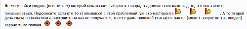 Не могу найти модуль (или че там) который показывает габариты товара, в админке вписываю в, д, ш, а в магазине не показываеться. Подскажите если кто то сталкивался с этой проблемкой где это настороить