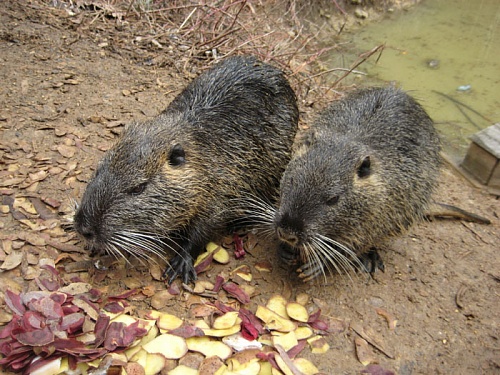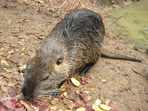 А рядом в небольшом озерце поселилось семейство грызунов - Ондатра. Зверьки совсем ручные, бояться только резких движений. Мы специально припасли отчистки картошки, моркови, свёклы и капусты и кормили их с рук. |