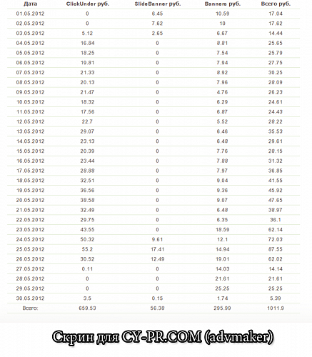 Сводная статистика за 30 дней (сайт с посещением в 3к, в начале было 1к, а после сайт начал набирать обороты и доходы естественно росли)