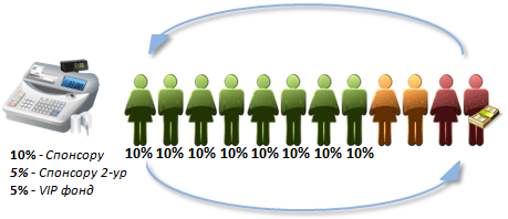 • Средства от ставки распределяются между 8-ми участниками (по 10% на каждого), находящимися в начале очереди. Остальные 15% идут спонсорам (10% и 5%), а 5% в фонд VIP пользователей.