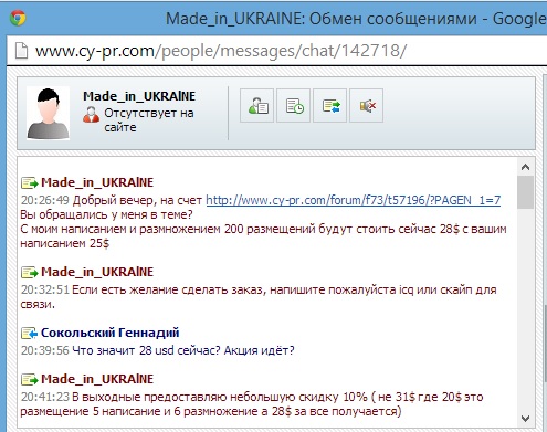 Здравствуйте! http://www.cy-pr.com/people/143069/ - мошенник написал. Только зарегился похожим именем, сразу же пишет, что появились новые сайты и предлагает ещё размещение. Подозреваю, что всем, кто отписывался в теме, он напишет.