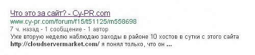 Всем доброго времени суток! У меня возник вопрос. Уже вторую неделю наблюдаю заходы в районе 10 хостов в сутки с этого сайта http://cloudservermarket.com/ я понял только, что он связан с серверами, дисками и облачными технологиями. Просмотрел его коды ссылок на мой сайт нет ни каких, а заходы с него идут. Может кто знает точное предназначение вышеуказанного сайта?