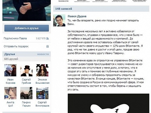 Позднее в своем аккаунте "Вконтакте" Павел Дуров подтвердил, что продал свою долю акций Ивану Таврину.»