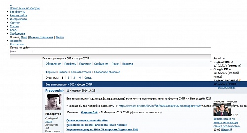 http://www.cy-pr.com/forum/ - IE - ошибка 502 http://www.cy-pr.com/forum/f35/t63518/m694388#message694388 - IE - все ок http://www.cy-pr.com/forum/topic/new - не показывает ничего Firefox с авторизацией http://www.cy-pr.com/forum/ и http://www.cy-pr.com/forum/topic/new/ - иногда ошибка 502 - закономерностей не нашел. Firefox без авторизации http://www.cy-pr.com/forum/ и http://www.cy-pr.com/forum/topic/new/ - ошибка 502, не всегда, но часто. Оперы и Хрома - нет. |