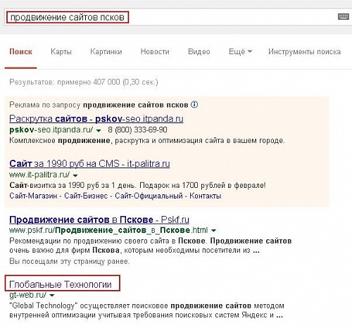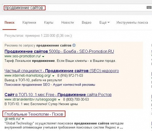 "Продвижение сайтов" - вебмастер показывает что сайта нет в топ 100 ни в яше, ни в гоше. "Продвижение сайтов псков" - Что искали со словами «продвижение сайтов псков» — 18 показов в месяц