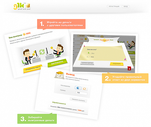 Идея система очень проста: Вы или Ваш приятель загадывает 1 вариант ответа из 2, выбирает ставку от 50 до 500 рублей и направляет вопрос Вам. А вы в свою очередь должны отгадать какой из 2-х вариантов ответа загадал Ваш соперник. Если Вы угадываете, то забираете ставку противника. Комиссия только за вывод средств из системы в размере 7%. За игры внутри системы комиссия не взимается.