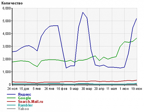 Я не скрываю, что мы точим сайты под поисковый трафик. Без поискового трафика наши сайты затраты не отобьют. Текущее соотношение поискового трафика примерно таково: 65% с Яндекса и примерно 30% с Гугла, мои сайты в принципе совпадают с распределением поисковых систем в Рунете.