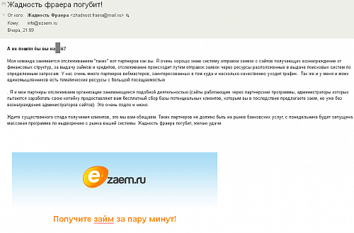 Собственно о чем речь. Те кто разместили у себя эту систему быстрых займов советую снимать, так как результат на лицо. В сообщении которое мне пришло было досконально описано как происходит нае*алово. Эта система быстрых займов получает с помощью нас контакты потенциальных клиентов, в партнерках через которые мы работаем по выдаче займов приходят отказы, а через какое то время по базе полученной с помощью наших сайтов осуществляется рассылка с предложением оформить заем без всяких проблем. Не могу не согласиться с отправителем, но система реально зажимает честно заработанные вебмастерами деньги. Как вы считаете должно быть место на наших сайтах таким системам как эта? |
