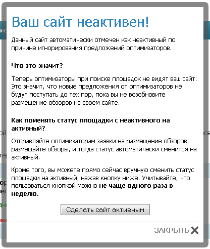 Новостей вроде бы никаких не было, но на почту пришло письмо Один из ваших сайтов автоматически поменял статус с активного на неактивный. Это значит, что теперь предложений от оптимизаторов станет меньше. Узнайте подробности на странице Вебмастер -> Мои площадки Картинки для наглядности |