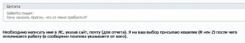 Необходимо написать мне в ЛС, указав сайт, почту (для отчета). Я на ваш выбор присылаю кошелек (R или Z) после чего оплачиваете работу (в сообщении платежа указываете от кого).
