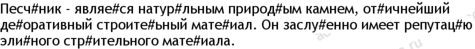 песчаник 15, материал 7, иза 6, камень 6, строительный 6, плитка 5, форма 5, изделие 4, край 3, кратный 3, оно 3, природный 3, внимание 2, грань 2, делаться 2, изготавливаться 2, клин 2, красота 2, морской 2, облицовка 2