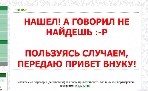 Все заметили, что в статистике "РЕФЕРАЛЫ" добавилась колонка "ICQ". Теперь прикол: Пишу всем не активным реферал, что они зарег. и не активны. Натыкаюсь на одного реферала. Разговор: Я: Здравствуйте "Он:". Ваш сайт прошел модерацию в Партнерской программе icqadvert.org . Хорошего Вам заработка!!!! По вопросам установки кода на сайт обращайтесь в техподдержку. [COLOR=#000000]Он: [/COLOR]? Он: не понял вас Я: Если Вы не регистрировались на сайте icqadvert.org, проигнорируйте это сообщение и удалите Наш UIN. Он: Я Владелец Данной партнерки Я: Здорово, значит Вы мой реферал. Он: Не) Сбой системы Я: Понятно. Он: сообщите ваш аккаунт Я: Я бы рад Вам сообщить свой аккаунт, но откуда я знаю, что Вы реально владелиц этой ПП. Напишу в техподдержку, если они подтвердят, сообщу им сам. Он: Жду тикета Я: Ок. Я: Подтвердили. Он: в онлайн поддержке? Я: ДА, 5% от дахода ПП мои. |