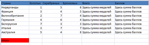 Если быть проще, то нужен почти обычный калькулятор, только немного навороченный, который вычисляет сумму медалей, введенных пользователем, и сумму баллов, начисляемых за медали, после нажатия на кнопку "Итоги". Набросал на экзеле примерный вид будущей програмки.