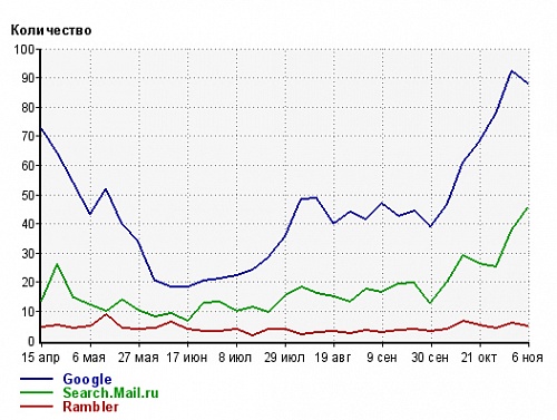 В итоге: по 9 из 20 отслеживаемым запросам в Яндексе в ТОП-10, по 3-м в ТОП-5, в Гугле по 2 из 20 в ТОП-10. ПО ВСЕМ запросам ОЧЕНЬ серьезный рост позиций в ПС. Проект коммерческий, так что посещаемость напрямую связана с продаваемостью. Парочка скриншотов по переходам с ПС. Масштаб взял недельный, чтобы свести на нет влияние выходных/праздников и тд |