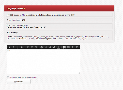 MySQL error in file: /engine/modules/addcomments.php at line 349 |