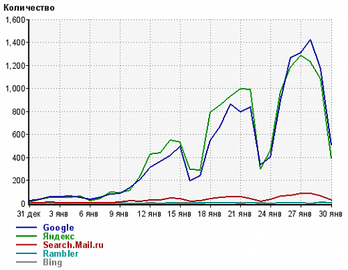 - Что касается посещаемости, после прогона в течение месяца был прирост посещаемости 100-150 хостов (ожидал немного большего, но получил немного меньшее, в целом не расстроен, но и глобальной радости нет)