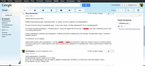 Кошелька у меня его нету, так как напрямую ему я не оплачивал, а оплачивал на несколько десятков кошельков, список которых мне дали. Почта есть, но ее уже называли на талквеббере - ilona.kiev1@yandex.ru. Переписку никогда не сохраняю, чтобы не мешали старые письма в ящике. Дальше не вижу смысла кому-либо что-либо доказывать и оправдываться. |