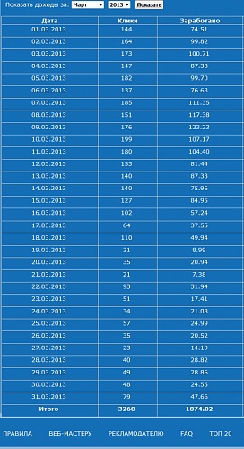 Пупырь эта партнёрка! Реклов нет практически, несколько убогих арбитражников с копеечным бюджетом, откручивают всякую хрень отстойную, а потом по пол дня в холостую! На бодике вааще вирусняк крутят два каких то калеки! Нема понтов вязаться, в один день можно набить до 500 рублёв, а потом несколько дней едва до сотни натягивает из - за простоев! Да платят, да без задержек, но в среднем заработок за неделю с тизерок получается многим больше и ещё не известно как на неё ПС реагируют, я не прочухал т.к снял коды и досвидос!
