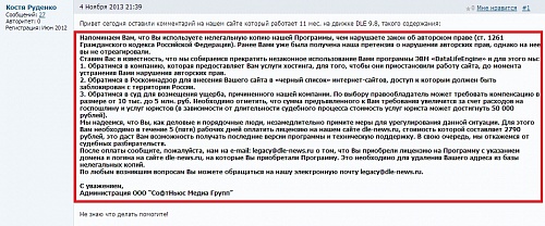 Ставим Вас в известность, что мы собираемся прекратить незаконное использование Вами программы ЭВМ «DataLifeEngine» и для этого мы: