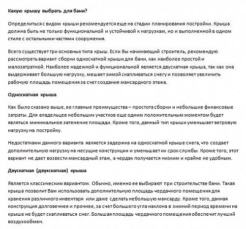Всего существует три основных типа крыш. Если Вы начинающий строитель, рекомендую рассмотреть вариант сборки односкатной крыши для бани, как наиболее простой и малозатратной. Наиболее надежной и функциональной является двускатная крыша, так как она выдерживает большую нагрузку, мешает зимой скапливаться снегу и позволяет увеличить рабочую площадь помещения за счет создания мансардного этажа.
