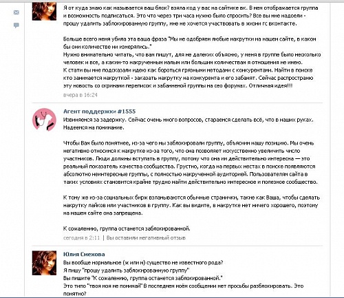 Не давно забанили группу в вк за накрутку подписчиков. Накручивал "очень" по чу-чуть и все равно забанили. Для меня новость вообще-то. 300 подписчиков за месяц (около), по 20-50 в день. Всего в группе было 350. Это тогда можно делать накрутку ботами на группу не понравившегося чела и написать жалобу. Бред конечно и так делать не буду, но факт остается фактом, что такое возможно!
