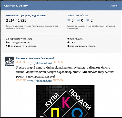 Приветствую. Размещу вашу рекламу в украинском региональном паблике Подслушано, 21 тысяча подписчиков 3500 уникальных посетителей в день.